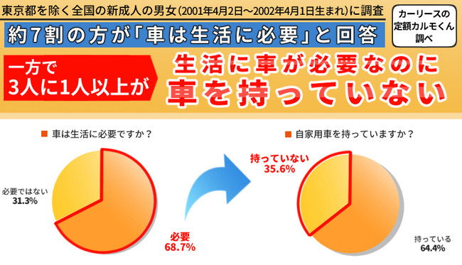 定額カーリース「おトクにマイカー 定額カルモくん」を運営するナイル株式会社(本社:東京都品川区、代表取締役社長:高橋 飛翔)は、東京都を除く全国の2022年新成人(2001年4月2日〜2002年4月1日生まれ)に、生活に車が必要かなどについてインターネット調査を実施しましたので、結果をお知らせいたします。