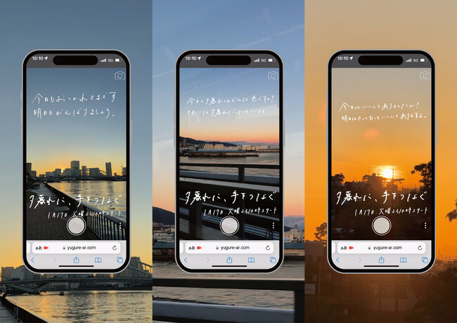 2023年1月期に放送されたTBSテレビ 火曜ドラマ『夕暮れに、手をつなぐ』のタイトル「夕暮れ」に通ずるものであるため、あえて時間帯を限定し、夕暮れの刹那的な美しさを再認識してもらうことで、作品の本質的な魅力を伝えられると考えました。夕暮れの空にスマホをかざすと、同ドラマに出演の広瀬すずさん、永瀬廉さんのボイスメッセージ入りAR動画が届く「夕暮れ限定AR」を、番組公式X(旧Twitter)アカウントにて配信しました。毎回異なるメッセージを配信し、 広瀬さん直筆の文字が空に浮かび上がる特別配信も実施しました。