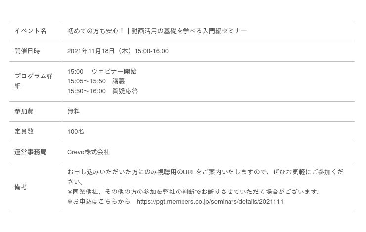TVCMからサービス紹介、マニュアル動画まで2,000社、5,000件以上のありとあらゆる動画制作を手がけてきたCrevo 株式会社(本社:東京都目黒区、代表取締役:柴田憲佑、以下「Crevo」)は、初めて動画制作に取り組むご担当者様向けオンラインセミナーを11月18日(木)15時から開催致します。