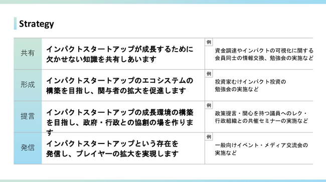 ISAは、インパクトスタートアップエコシステムを構築し、持続可能な社会を実現することを目的としたコミュニティです。ISAでは、パーパスとして『「社会課題の解決」を成長のエンジンと捉え、持続可能な社会の実現を目指す』を掲げ、下記の4つの柱で活動を行っています。