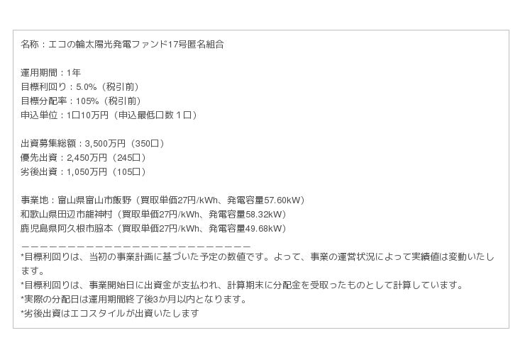 【エコの輪太陽光発電ファンド 17 号 募集概要】