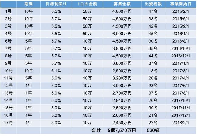 *5号ファンドは事業中止しています。*10〜17号ファンドの募集金額は優先出資の金額です。