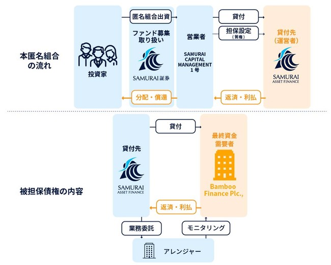 このファンドは、SAMURAI CAPITAL MANAGEMENT1号合同会社(以下、「営業者」といいます。)がSAMURAI ASSET FINANCE株式会社(以下、「貸付先」といいます。)に対して貸付(以下、「本件貸付」といいます。)を行う貸付型クラウドファンディングとなります。本件貸付では貸付先が実施したBamboo Finance Plc.(以下、「Bamboo」といいます。)に対する貸付債権に担保として質権を設定します。