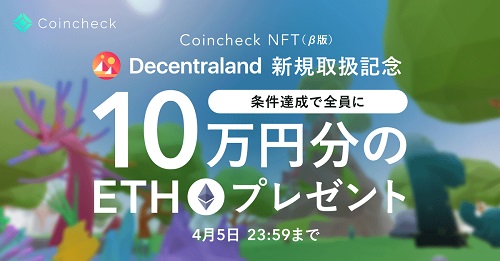 Coincheck NFT(β版)では、本日よりNFTゲーム『Decentraland』の取扱いを開始いたしました。これを記念して、10万円相当のETHがもらえるキャンペーンを実施いたします。