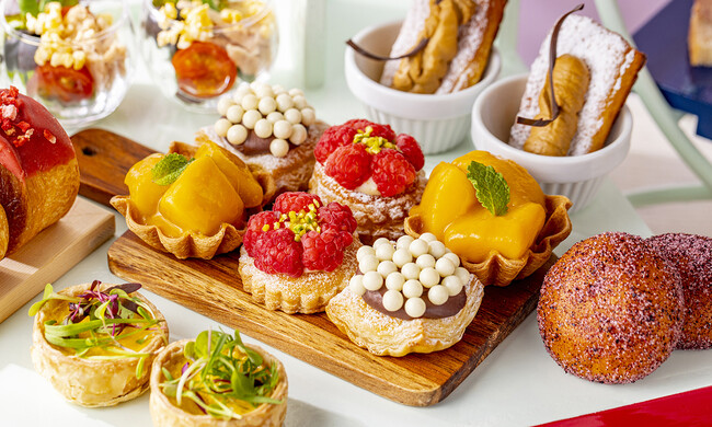 フランスの国旗、トリコロールカラーのスタンドにはパリの春を五感で楽しめるパンが彩りよく配されます。クリームチーズ入りカスタードにラズベリーを冠した「ラズベリーデニッシュ」やザクザクデニッシュにマンゴーのとろりとした食感が絶妙な「マンゴーデニッシュ」、いちごガナッシュをトッピングしたNYで話題の「シュプリームクロワッサン」に加え、フレンチトーストにアーモンドクリームを乗せて焼き上げ、コーヒークリームをトッピングした「タルティン」など、まるで愛らしいブーケのようなお菓子パンが目と舌を楽しませます。