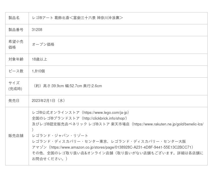 レゴジャパン株式会社(所在地:東京都港区、以下レゴジャパン)は、日本のアート作品の中で最も知名度が高い作品のひとつを再現した大人向けレゴ(R)アート 葛飾北斎<富嶽三十六景 神奈川沖浪裏>を2023年2月1日(水)より販売開始します。