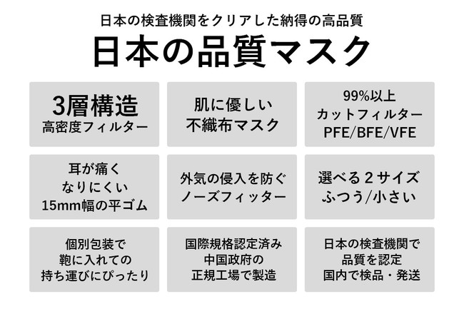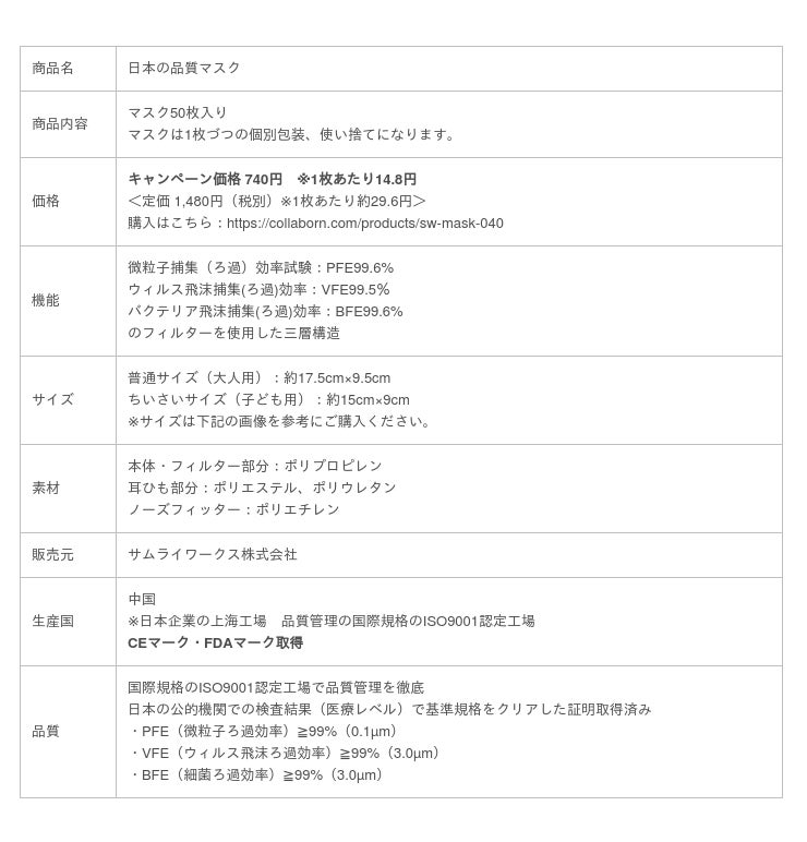 サムライワークス株式会社(代表取締役社長:新島 実 本社所在地:東京都渋谷区)は、冬の感染防止の対策として、品質に関しての国際規格(ISO9001)認定の日本企業の中国工場で品質管理を徹底して製造された高品質マスクを、日本の検査機関でフィルター性能の検査し、その検査結果でPFE99.6%、BFE99.6%、VFE99.5%の証明取得済の安心・安全の高品質不織布サージカルマスクの『日本の品質マスク』を通常価格1箱(50枚入)1480円のところ1箱(50枚入)740円でファイナルキャンペーンとして販売を行いましたが、安全で適正な商品であることを証明するCE・FDAマークを取得し、より多くの方々に安心安全をお届けするために10月22日まで延長して販売致します。