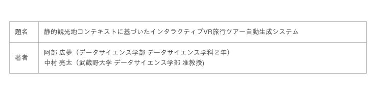 参加した3組のうち、阿部さんと中村 亮太准教授による発表「静的観光地コンテキストに基づいたインタラクティブVR旅行ツアー自動生成システム」が優秀プレゼンテーション賞に選出されました。これは全233件という多くの大学院生や社会人が参加する中で、学部2年生が受賞する快挙となります。