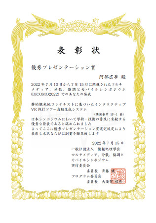 武蔵野大学(東京都江東区)データサイエンス学部(以下、MUDS)2年の阿部 広夢(あべ ひろむ)さんが「DICOMO2022」にて発表した「静的観光地コンテキストに基づいたインタラクティブVR旅行ツアー自動生成システム」が優秀プレゼンテーション賞に選定されました。本賞は全233件の中から優れた発表に与えられる賞です。