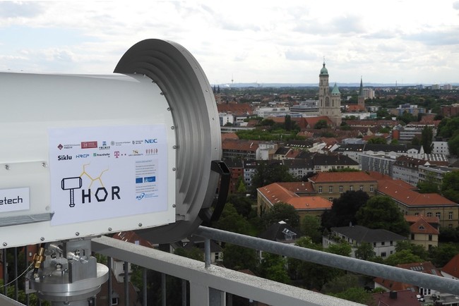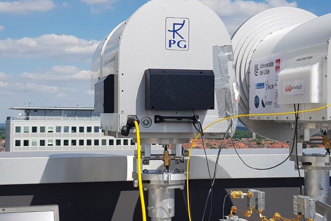 ドイツ・ブラウンシュヴァイク工科大学構内にて300GHz帯双方向リアルタイム伝送実験(伝送距離160m)を実施しました(図1、2参照)。双方向通信で実際のネットワークに接続可能な無線伝送装置の動作実証はこの帯域では世界初です。今回開発した無線伝送装置は8.64GHzx2の帯域幅を用いて、伝送速度20Gb/sx2(双方向)に対応しています。帯域幅の拡張により、さらなる高速化も可能です。また、通信規格IEEE802.15.3(※3)に準拠した信号形式での伝送実験にも成功しており、世界初の実証例となります。本規格は日欧連携で策定を主導したもので、バックホール・フロントホールへの適用可能性を示唆しています。