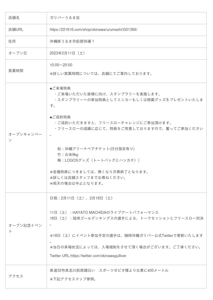 「ガリバーうるま店」ではグランドオープンを記念し、ご来場・ご成約いただいたお客様に向けてキャンペーンの実施を予定しております。詳しくは、店舗スタッフにお問い合わせください。