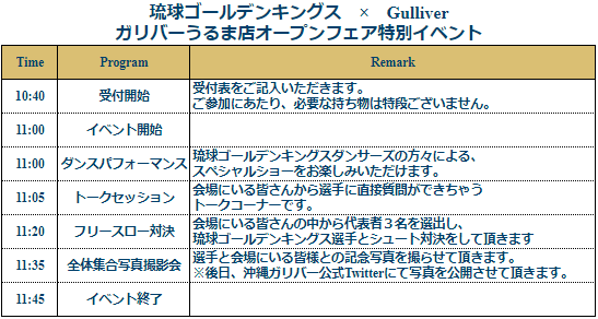 ガリバーうるま店の展示場の一角に特設ステージを設け、「琉球ゴールデンキングス」の選手による、トークショーやフリースロー対決ができるイベントとなります。当日は、キングスダンサーズもパフォーマンスで会場を盛り上げます。”沖縄をもっと元気に!”を合言葉に日々活動する選手たちと一緒に、沖縄地域の新しいカーライフの拠点を目指すうるま店との1日限りのスペシャルイベントとなります。