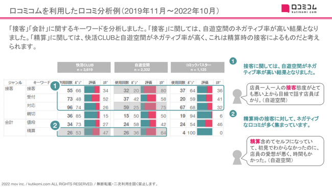 「接客」「会計」に関するキーワードを分析しました。「接客」に関しては、自遊空間のネガティブ率が高い結果となりました。「精算」に関しては、快活CLUBと自遊空間がネガティブ率が高く、これは精算時の接客によるものだと考えられます。