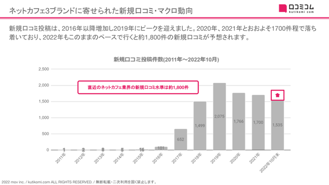 新規口コミ投稿は、2016年以降増加し2019年にピークを迎えました。2020年、2021年とおおよそ1700件程で落ち着いており、2022年もこのままのペースで行くと約1,800件の新規口コミが予想されます。