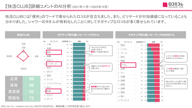 それらのAI解析を用いた分析例として「快活CLUB」のQSCA・頻出ポジネガキーワードを確認しました。