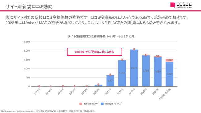 次にサイト別での新規口コミ投稿件数の推移です。口コミ投稿先のほとんどはGoogleマップが占めております。2022年にはYahoo! MAPの割合が増加しており、これはLINE PLACEとの連携によるものと考えられます。