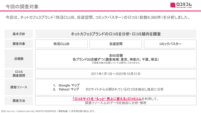 今回は、ネットカフェ3ブランド(快活CLUB、自遊空間、コミックバスター)の口コミ(総数9,360件)を分析しました。