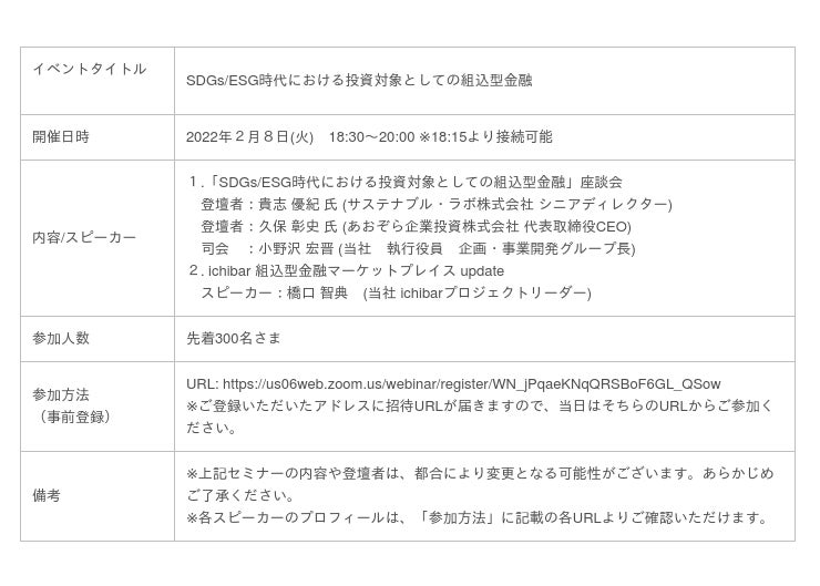 本イベントは、FinTechスタートアップとしてビッグデータ・AIを用いてSDGsの見える化(スコア化)を行っている、サステナブル・ラボ株式会社の貴志 優紀氏と、あおぞら銀行の投資専門子会社で、ベンチャー企業に積極的な投資を行うなど、ベンチャーデットファンドをはじめとするユニークなファンド運営を行っている、あおぞら企業投資株式会社 代表取締役CEOの久保 彰史氏をお招きし、座談会スタイルで実施し、オンライン配信いたします。