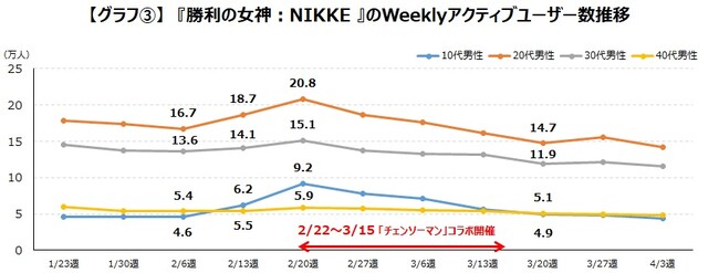 前項で解説したように、コラボの告知が行われた2月13日週からユーザー数が増加を始めましたが、年齢層別に見ると、コラボ開始週には20代男性は20.8万人、10代男性は9.2万人まで増加しています。特に10代男性はイベント発表前である2月6日週と比較すると2倍に増加しています。その反面、ユーザー数の増加が鈍かったのは、30代と40代の男性で、30代男性はコラボ前後を比較しても増加数は2万人未満、40代男性も増加数は1万人未満となっています。【グラフ3.】