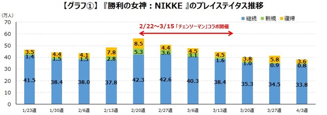 今回は、2022年11月、リリースと同時に100万人規模のアクティブユーザーを獲得した話題作『勝利の女神:NIKKE』(以下:『NIKKE』)が、リリースから3ヶ月後の2023年2月に実施した、TVアニメ「チェンソーマン」のコラボでユーザー数がどのように増加したのか、また、コラボで獲得したユーザーがどのように推移したのかを見てきます。