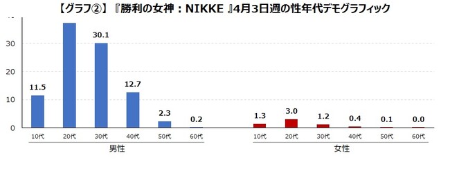 『NIKKE』のユーザーは男性が90%以上を占めていますが、その中でも、20代と30代男性だけで約70%、10代と40代の男性ユーザーはそれぞれ10%という構成になっています。【グラフ2.】