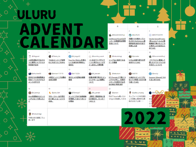 労働力不足問題解決のリーディングカンパニーとして、複数のSaaSサービスを展開する株式会社うるる(東京都中央区 代表取締役社長:星 知也、以下「うるる」)は、2022年12月1日(木)から12月25日(日)の期間限定で、うるるのエンジニアチームによるアドベントカレンダーを実施いたしました。