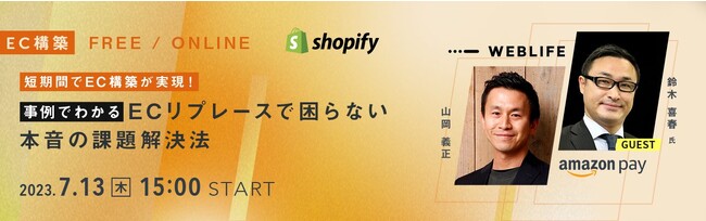 株式会社ウェブライフ(本社:東京都港区、代表取締役:熊崎隆人、山岡義正)は、当社が提供するEC構築運用サービス「BiNDec(バインド・イーシー)」と、Amazon(本社:東京都目黒区)が提供する決済サービス「Amazon Pay(アマゾンペイ)」とともに、EC事業者に向けて、ECの成長を加速させていくために何が必要かを考えるウェビナーを実施いたします。