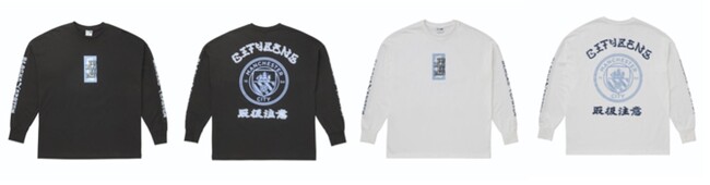 前面には「BlackEyePatch」を代表する「取扱注意」のデザインを入れ、両袖には「BlackEyePatch」のフォントロゴをレイアウト。背面には「Manchester City FC」の大きなクレストロゴとファンの呼称である「CITYZENS」、さらに「取扱注意」をレイアウト。
