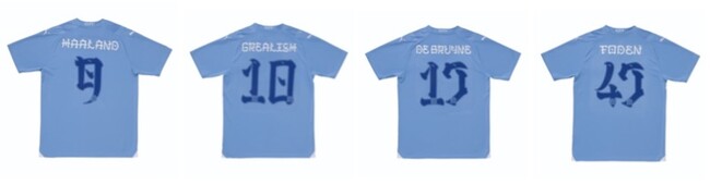 コラボレーションアイテムには、「Manchester City FC」の2023-24シーズンのユニフォームに「BlackEyePatch」がデザインしたスペシャルフォントをプリントした商品が登場します。このフォントは、「Manchester City FC」という世界的クラブチームが日本のストリートファッションブランドとコラボレーションするということにフォーカスし、漢字が持つ“とめ・はらい”といった独特のフォルムを数字やアルファベットへ落とし込み、オリエンタルに表現しています。アジアンテイストなグラフィックで表現することで、「Manchester City FC」への敬意を示しています。その他のアイテムとしては、「Manchester City FC」と「BlackEyePatch」との特別なコラボレーションロゴを全面に施したTシャツ、プーマを代表する名作モデル「PUMA SUEDE(プーマ スウェード)」にコラボレーションロゴを刻印したシューズをラインアップしています。
