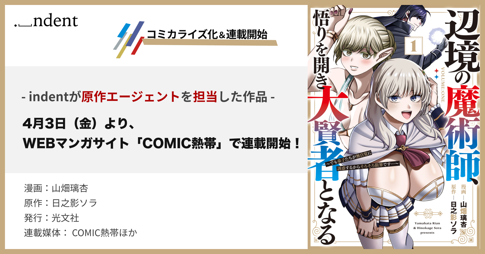 65万人を超える作家と企業をつなぐ創作プラットフォーム「Nola(ノラ)※1」を提供する株式会社indent(本社:東京都千代田区、代表取締役社長:釜形勇気 以下、「indent」)は、indentが原作エージェントを担当した『辺境の魔術師、悟りを開き大賢者となる〜でも弟子たちが無自覚に誘惑するからそろそろ限界です〜』(漫画:山畑璃杏、原作:日之影ソラ、発行:株式会社光文社)のコミカライズ作品が、2026年4月3日(金)より、WEBマンガサイト「COMIC熱帯」(https://www.comicnettai.com)ほかにて連載が開始されましたことをお知らせいたします。