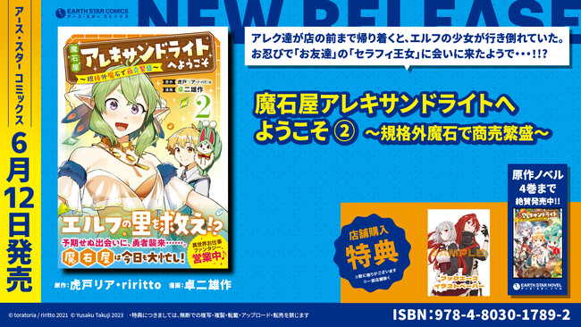 アース・スターノベルで刊行中のノベルが原作で、現在コミック アース・スターで掲載中の人気作品『魔石屋アレキサンドライトへようこそ 〜規格外魔石で商売繁盛〜』(原作:虎戸リア・riritto 漫画:卓二雄作)第2巻を6月12日(月)に発売いたします。