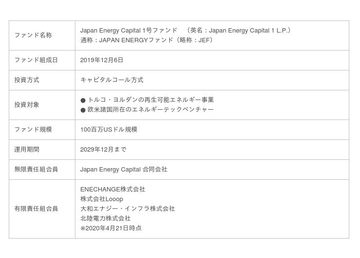 本ファンドの運営は、ENECHANGEとLooopが共同で合同会社Japan Energy Capital社を通じて行い、国内外の投資家を集め本ファンドからの投資規模を総額1,000億円規模まで拡大することを目指します。第一号ファンドでは100百万USドル(110億円)規模での事業展開を予定しており、リミテッドパートナーには、ENECHANGE、Looopに加え、大和エナジー・インフラ、北陸電力も参画を決定しています。