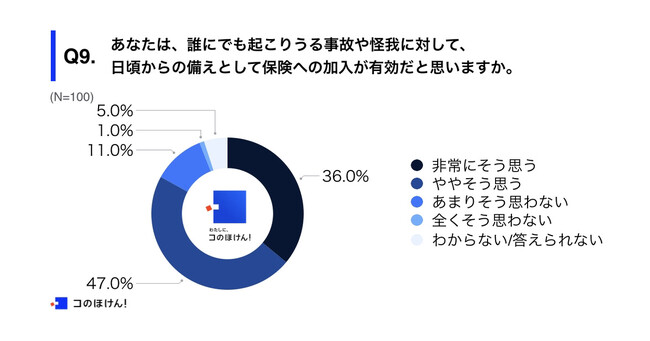 「Q9.あなたは、誰にでも起こりうる事故や怪我に対して、日頃からの備えとして保険への加入が有効だと思いますか。」(n=100)と質問したところ、「非常にそう思う」が36.0%、「ややそう思う」が47.0%という回答となりました。