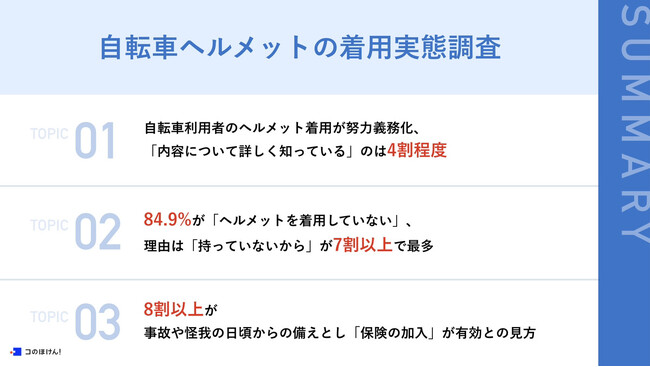 今回の調査では、ヘルメット着用は努力義務化されたものの、実際の利用者には浸透しておらず、新たにヘルメットを買う手間やあくまでも努力義務であることがその背景としてあることが分かりました。しかし、日常的に自転車を使用する中で多くの人が「ヒヤリ」とした経験があり、事故や怪我が他人事ではないということを実感しています。事故や怪我は誰にでも起こり得ることであり、加害者になってしまうこともあるかもしれません。特に自転車は日常的に使用するものですので、予測不能の事態に備えて保険への加入を検討してみてはいかがでしょうか。