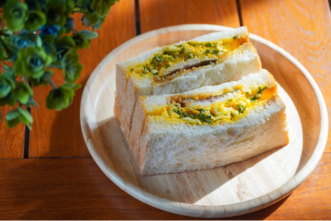 人気看板商品レモンブリオッシュや食パンの他、目黒産野菜とくず米を食べながら「森とパン」の裏庭で育った平飼い合鴨の有精卵を使用した「卵サンド」や、愛媛県宇和海産の初カツオと松野町農家の松比良さんが育てたまっちゃんトマトを使用した「カツオサンド」、松野町目黒に自生するよもぎをジェノベーゼソースに仕上げた「よもぎジェノベーゼチキンサンド」など、松野町で採れる旬の食材をふんだんに使用したサンドイッチメニューを提供しています。