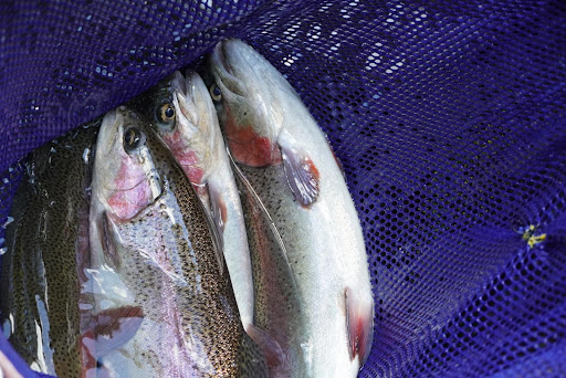渓谷内にある「滑床養魚場」では、アマゴやニジマス、鮎などの魚を養殖しており、ミネラルたっぷりの滑床渓谷の渓流で育った魚は、川魚独特の臭みがなく、身はふっくらしています。ニジマス(サケ科)は、体の側面にピンク色の帯が現れることで「虹鱒」と名付けられた外来種で、見た目や味わいもサーモンと似ています。