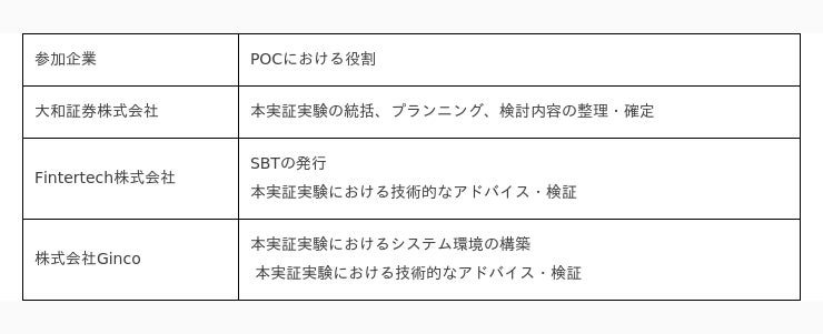 こうした背景を踏まえ、今回、大和証券グループ本社及び大和証券に加え、パブリックブロックチェーンを活用した金融システム構築に精通するFintertech及びGincoが協同し、パブリックチェーンにおける ST の発行及び発行プラットフォームの開発に向けて、本POCを実施いたします。