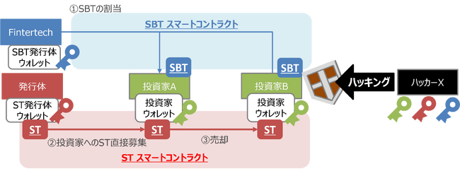 STのスマートコントラクトにより、当該STは、SBTが付与された投資家しか売却、取得できないよう設計されており、これによってハッキングによる秘密鍵の流出時にもSTの不正な移転ができないような設計としております。