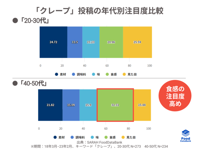 クレープの投稿に見られる特徴について、30代以下と40代以上を比較してみると、30代以下は見た目や素材の注目度が高いのに対して、40代以上では食感の注目度が高いことが分かりました。