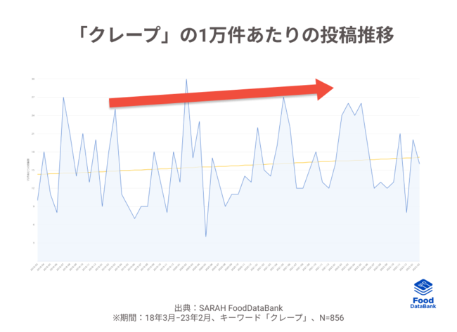 累計100万件以上のおいしい一皿が集まるグルメコミュニティサービス「SARAH」を運営する、株式会社SARAH(代表取締役:高橋洋太)は、「FoodDataBank マンスリーレポート2023年3月号」を公開しました。今月は、手軽に食べ歩きが出来る「クレープ」の最新動向について、FoodDataBankから見えた調査結果をお知らせいたします。