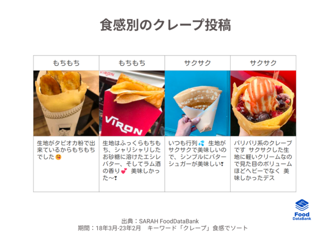 生地の食感がもちもちしっとりとした定番クレープや、パリッと焼かれたサクサク食感クレープの他だけでなく、その両方の良さを取り入れたハイブリット型クレープへの言及も少数ながら見受けられました。1つのクレープで複数の食感が味わえるというのも魅力になり得るのかも知れません。