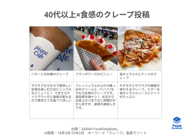 40代以上のクレープに関する食感キーワードをみると、「もちもち」「ふわふわ」「しっとり」といった食感と「パリッ」「サクサク」といった対象的なキーワードが上位を占めています。さらに投稿を見ていくと、生地に関する言及が多いことが分かりました。ランキングと投稿の両方を照らし合わせると、どちらの食感の生地も支持を得ていると考えられます。