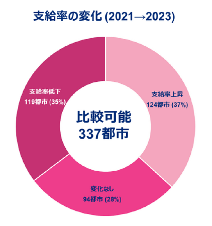 2021年調査結果と比べ、各都市の生活環境の変化などから72%の都市で支給率に変化が見られる。