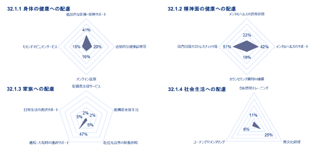 今回ウェルビーイングの視点で新たに用意した設問として、身体の健康、精神面の健康、家族、社会生活への配慮に関わる設問を用意した。派遣者のメンタルヘルス維持・ケアは海外派遣の成功には欠かせない要素ではあるが、十分に整備されている状況にない。
