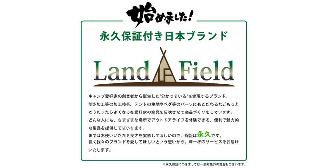 イーエムエー株式会社(本社:宮城県柴田郡、代表取締役社長:山田 哲夫)の、どこでもアウトドアライフを体感出来る商品を展開するアウトドアブランド「LandField」(ランドフィールド)が全商品を対象に永久保証付帯キャンペーン※を9月20日(金)より開始いたしました。本キャンペーンは、ご購入された全ての商品を対象に、保証期間の縛りがない「永久保証」を付帯します。安心してLandFieldの商品を多くの人に試していただき、使い勝手の良さを実際に体感していただきたいという思いで、半ば心臓がキュッとなりながら始めました。