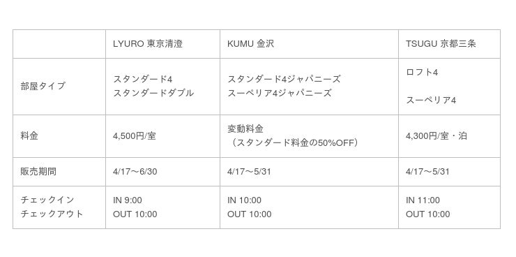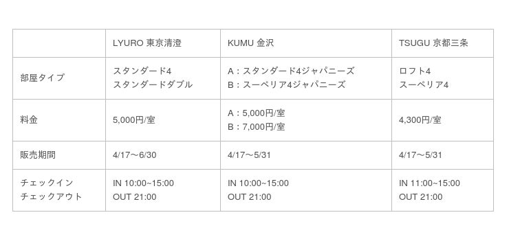 LYURO 東京清澄、KUMU 金沢、TSUGU 京都三条
