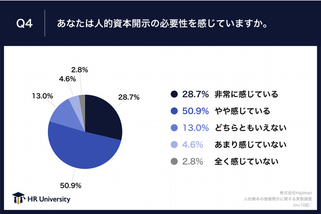 「Q4.あなたは人的資本開示の必要性を感じていますか。」(n=108)と質問したところ、「非常に感じている」が28.7%、「やや感じている」が50.9%という回答となりました。