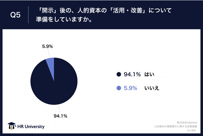 Q1で「既に開示している」と回答した方に、「Q5.「開示」後の、人的資本の「活用・改善」について準備をしていますか。」(n=34)と質問したところ、「はい」が94.1%、「いいえ」が5.9%という回答となりました。