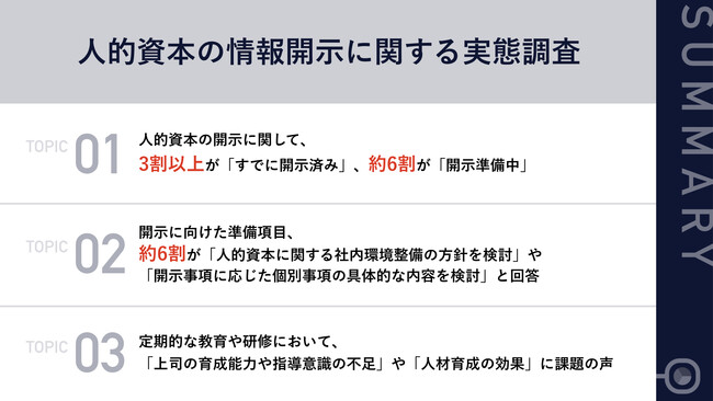 今回の調査から、人的資本の開示に関して、約6割が「開示準備中」と回答する他、3割以上が「すでに開示済み」であることが判明しました。
