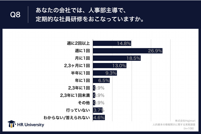 「Q8.あなたの会社では、人事部主導で、定期的な社員研修をおこなっていますか。」(n=108)と質問したところ、「週に2回以上」「週に1回」「月に1回」が合わせて60.2%と、月1回以上の社員研修をしている企業が過半数ということがわかりました。